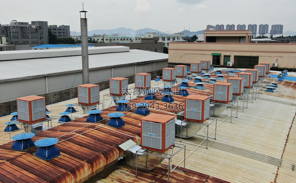"潤(rùn)東方"環(huán)保空調(diào),安裝費(fèi)用低,運(yùn)行費(fèi)用少,平均每百平方米車間降溫每小時(shí)費(fèi)用僅需1度電,特別適合在生產(chǎn)型企業(yè)的車間里使用,下圖為廈門某車間降溫安裝潤(rùn)東方環(huán)??照{(diào)的工程圖片: